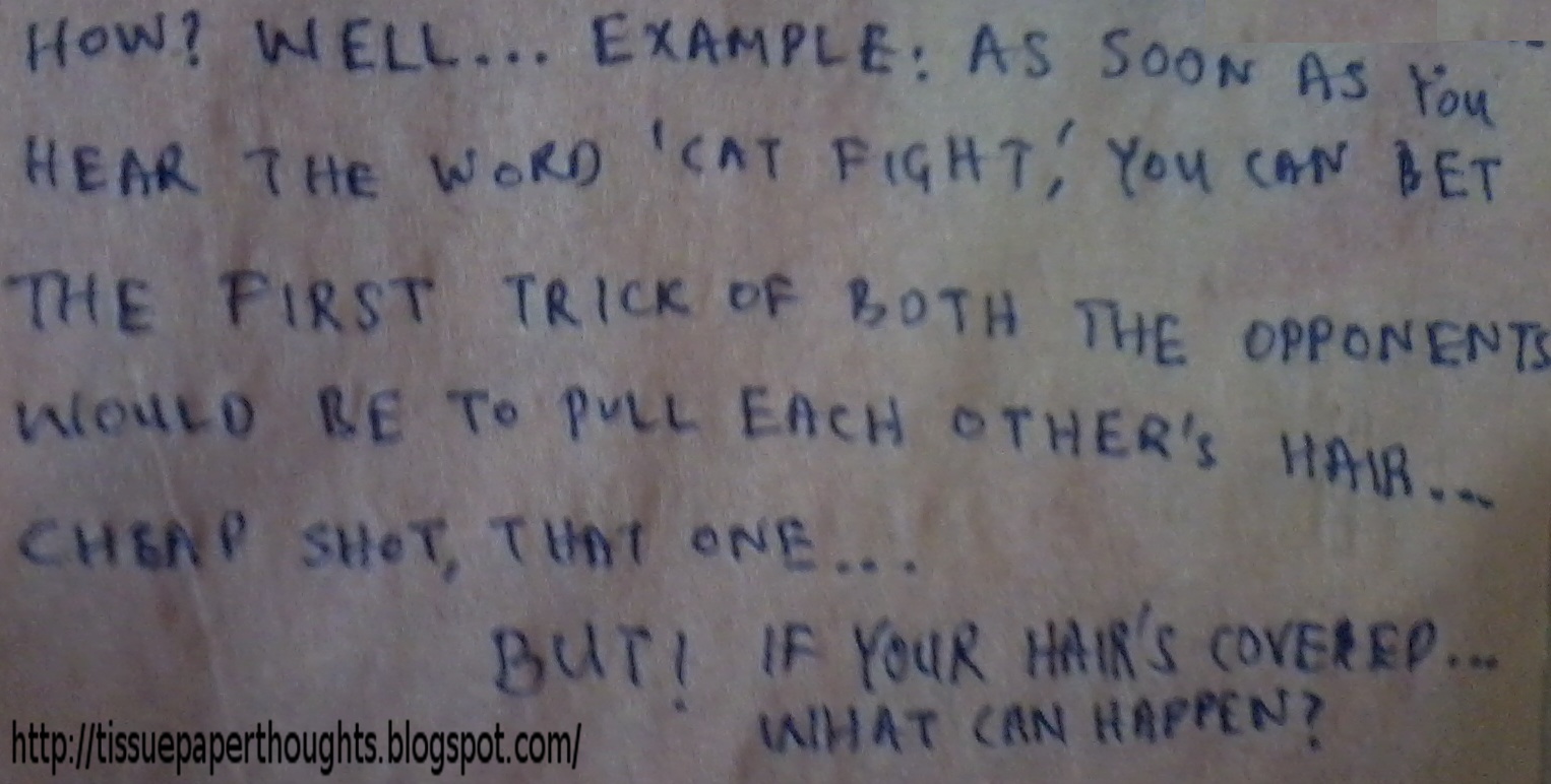 And while we're talking about cat fights, the only ammunition girls have is HAIR. I remember coming home from school and telling my dad about a catfight and even he said "Well, overall I'm guessing no harm done - hair can grow back" :P I am so glad I have short hair so I'm safe (relatively speaking).
